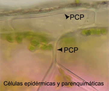 En estas fotografías vemos células vegetales únicamente con pared celular primaria. Esta pared puede ser delgada como en las células parenquimáticas o bien, estar engrosada en forma desigual como en las células del tejido de sostén, el colénquima.